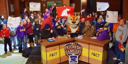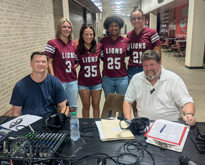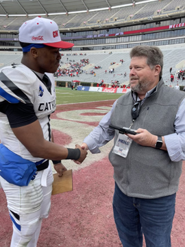 Michael and Graham at River Region Sports Prep Media Day with flag football players from Prattville at Garrett Coliseum